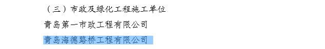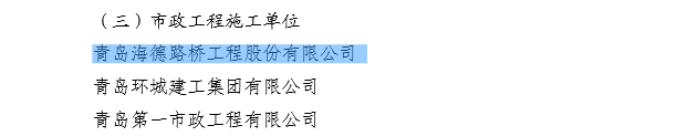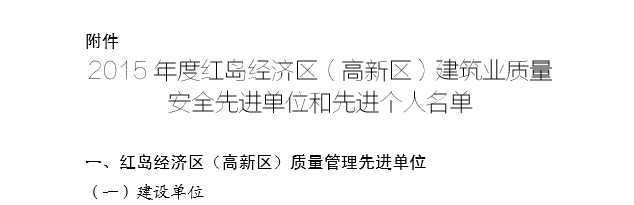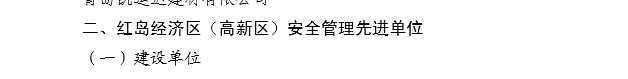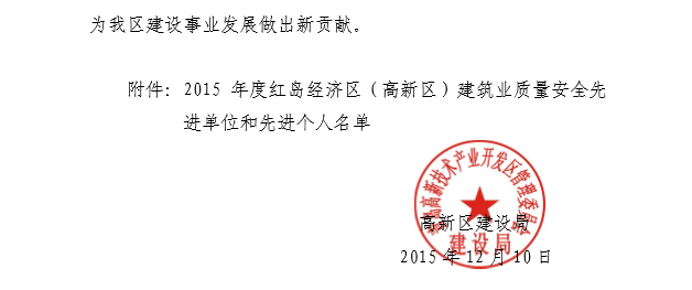 2015年12月,青島高新技術產(chǎn)業(yè)開發(fā)區(qū)建設局下發(fā)《青高新建【2015】48號》文件,表彰2015年度紅島經(jīng)濟區(qū)(高新區(qū))建筑業(yè)質量安全先進單位和先進個人。公司作為參與高新區(qū)市政工程建設的施工單位,榮獲“質量安全先進單位”的殊榮,一分公司程顯光和鄒曉杰分別獲得“質量管理先進個人”和“安全管理先進個人”的光榮稱號。