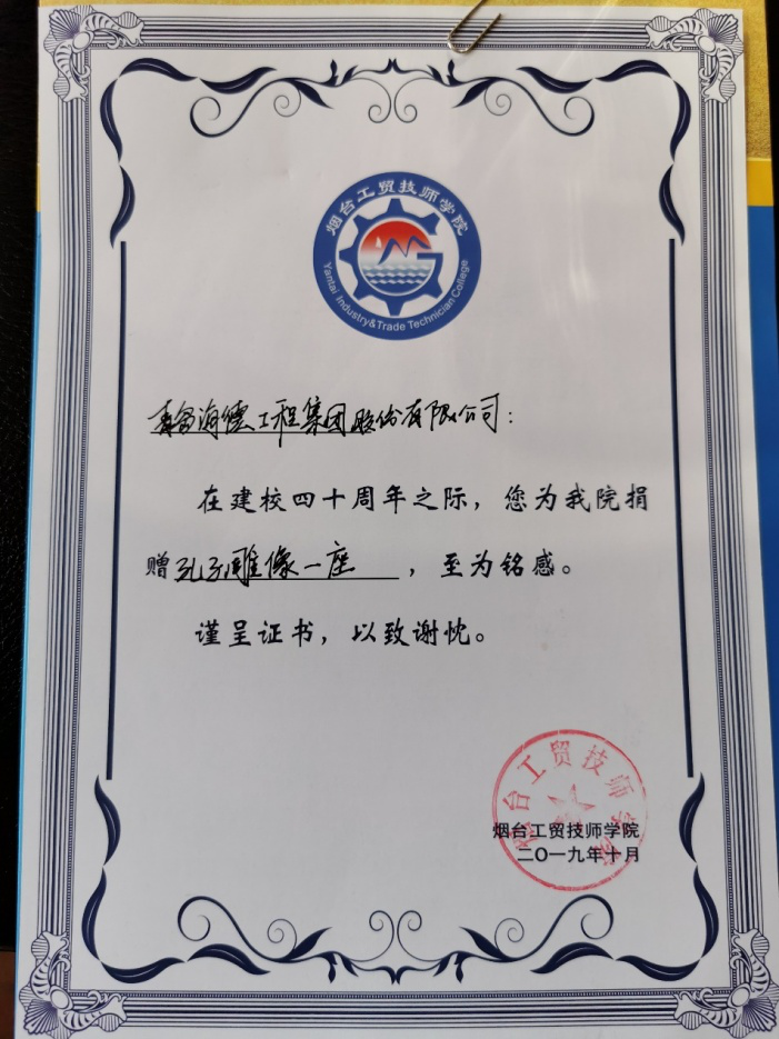 2019年10月25日,值煙臺(tái)工貿(mào)技師學(xué)院迎來建校40周年暨國(guó)家級(jí)高技能人才培訓(xùn)基地揭牌儀式之際,集團(tuán)公司向煙臺(tái)工貿(mào)技師學(xué)院捐贈(zèng)孔子雕像一座,以此表達(dá)對(duì)學(xué)院建校40周年的祝賀。煙臺(tái)工貿(mào)技師學(xué)院校領(lǐng)導(dǎo)、集團(tuán)公司煙臺(tái)分公司負(fù)責(zé)人參加捐贈(zèng)儀式。