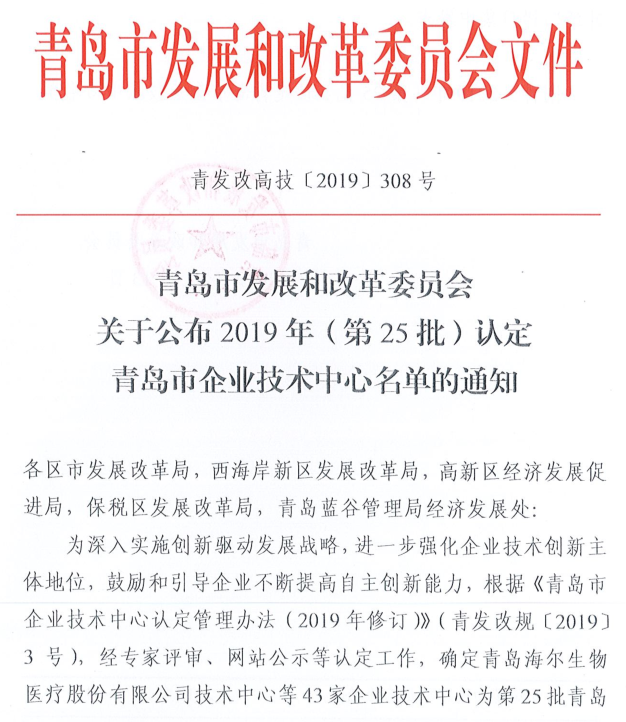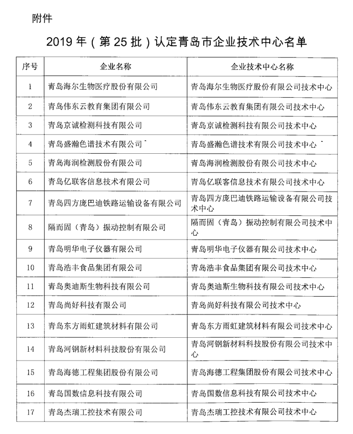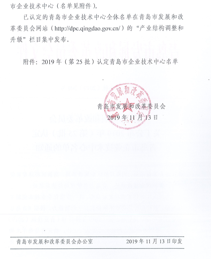 2019年11月13日,青島市發(fā)展和改革委員會(huì)正式發(fā)文《關(guān)于公布2019年(第25批)認(rèn)定青島市企業(yè)技術(shù)中心名單的通知》(青發(fā)改高技[2019]308號(hào)),我公司企業(yè)技術(shù)中心通過(guò)了青島市認(rèn)定。