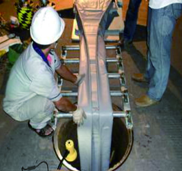 該技術(shù)原理為:使用水下內(nèi)窺機(jī)器人檢查管道破損情況;根據(jù)破損情況將滲透樹脂的玻璃纖維,從檢查井口通過專業(yè)技術(shù)人員、專用設(shè)備拉入所要修復(fù)的管道內(nèi)部;封閉兩端管口,在此玻璃纖維內(nèi)襯管內(nèi)充壓縮空氣;最終采用紫外線車自動化控制設(shè)備進(jìn)行照射使樹脂滲透進(jìn)破損管道縫隙完成修復(fù)。僅用4個小時,即可完成管道修復(fù)。