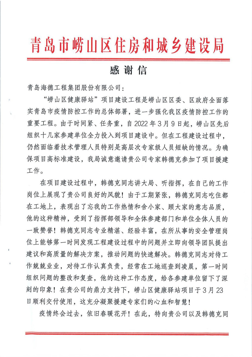 近日,嶗山區(qū)住房和城鄉(xiāng)建設(shè)局向我集團公司發(fā)來感謝信,對我集團公司派駐“嶗山區(qū)健康驛站”援建項目的集團總裁助理、代建事業(yè)部總經(jīng)理韓德克同志提出表揚,對集團公司及韓德克同志在建設(shè)過程中作出的突出貢獻(xiàn)表示衷心的感謝,并致以崇高的敬意!