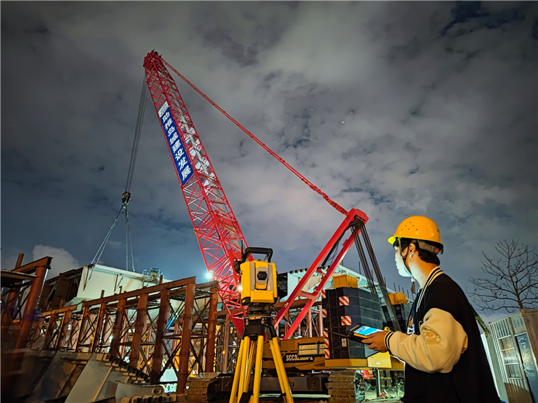 為了不影響白天道路的正常通行,深圳路節(jié)點橋鋼箱梁的吊裝工作進(jìn)行夜間搶工。在施工過程中最新引入了“北斗精確定位”鋼箱梁分塊數(shù)據(jù)檢測系統(tǒng),吊裝過程中,放置在一旁的智能儀器會緊緊地“盯住”吊裝梁體,快速處理來自北斗衛(wèi)星的信息,通過手持式智能顯示屏為地面人員提供“毫米級”精度定位數(shù)據(jù),助力項目安全高效建設(shè)。