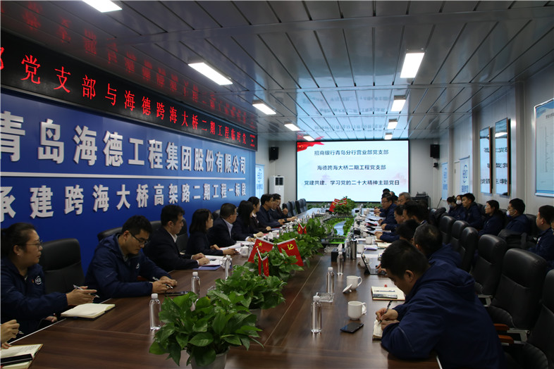 2022年12月5日下午,青島海德工程集團跨海大橋二期工程臨時黨支部與招商銀行青島分行營業(yè)部黨支部在海德集團跨海大橋高架路二期工程項目部會議室聯(lián)合開展“黨建共建”、“學習貫徹黨的二十大精神”主題黨日活動。黨的二十大代表、招商銀行青島嶗山支行大堂主管王瑾敏,嶗山區(qū)工信局機關黨委副書記董元波,招商銀行青島分行黨委委員、副行長侯登峰,營業(yè)部黨支部書記柳宏,海德集團黨總支書記、董事長鞏光磊,黨總支副書記、副總裁呂同占,大橋項目部臨時黨支部書記孫成山,黨支部全體黨員、預備黨員、入黨積極分子等共同參加了此次活動。海德集團黨總支副書記、副總裁呂同占主持活動。
