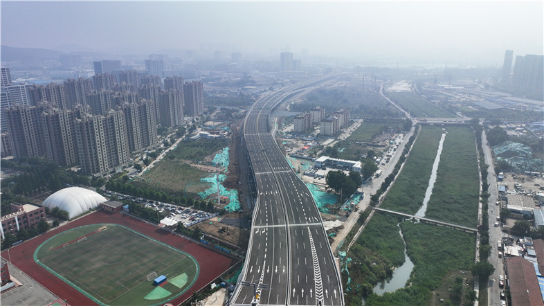 跨海大橋高架路是東岸城區(qū)“四縱五橫”快速路網(wǎng)中的第三橫,既是承接膠州灣大橋交通銜接功能的門戶通道,也是貫通東西,實現(xiàn)區(qū)域互通互聯(lián)的市區(qū)東西向主動脈。跨海大橋高架路二期工程主線西接現(xiàn)狀海爾路立交,跨越深圳路后,東側(cè)采用互通立交與青銀高速聯(lián)系,全長1.6km。高架路二期與青銀高速近期先實施北向西、西向北、西向南3條匝道。
