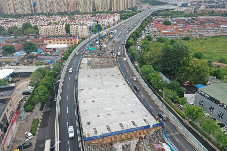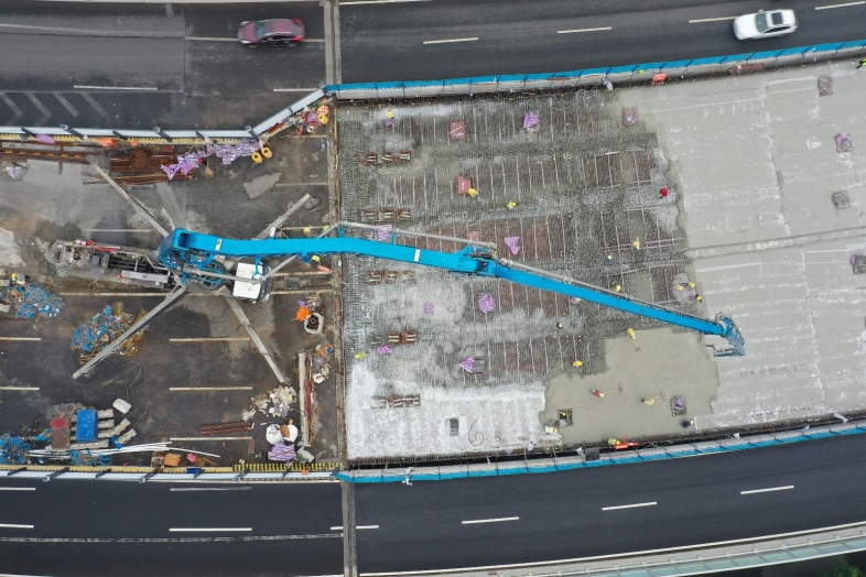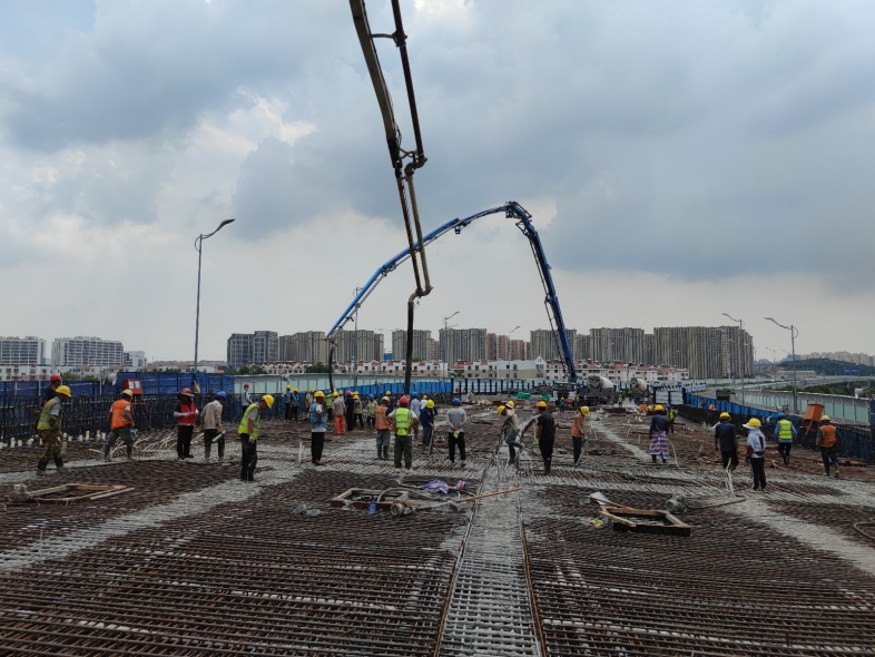 重慶路快速路工程南起山東路,北至仙山路,全長17.7公里,項目建成后能夠有效緩解城區(qū)南北向路網交通擁堵,提高整體通行效率,支撐沿線產業(yè)園區(qū)加速發(fā)展。我集團負責施工的四標段現(xiàn)澆箱梁共兩聯(lián),長度分別為90m、70m,南接現(xiàn)有高架,北接新建50m鋼混組合連續(xù)梁。本次澆筑的第一聯(lián)箱梁長90m,寬25.6m,橋梁面積2304㎡,混凝土用量1945.7m3、強度C50,鋼筋用量336.34t,鋼絞線用量91.34t,現(xiàn)場使用兩臺汽車泵同時澆筑,澆筑時間持續(xù)30小時。